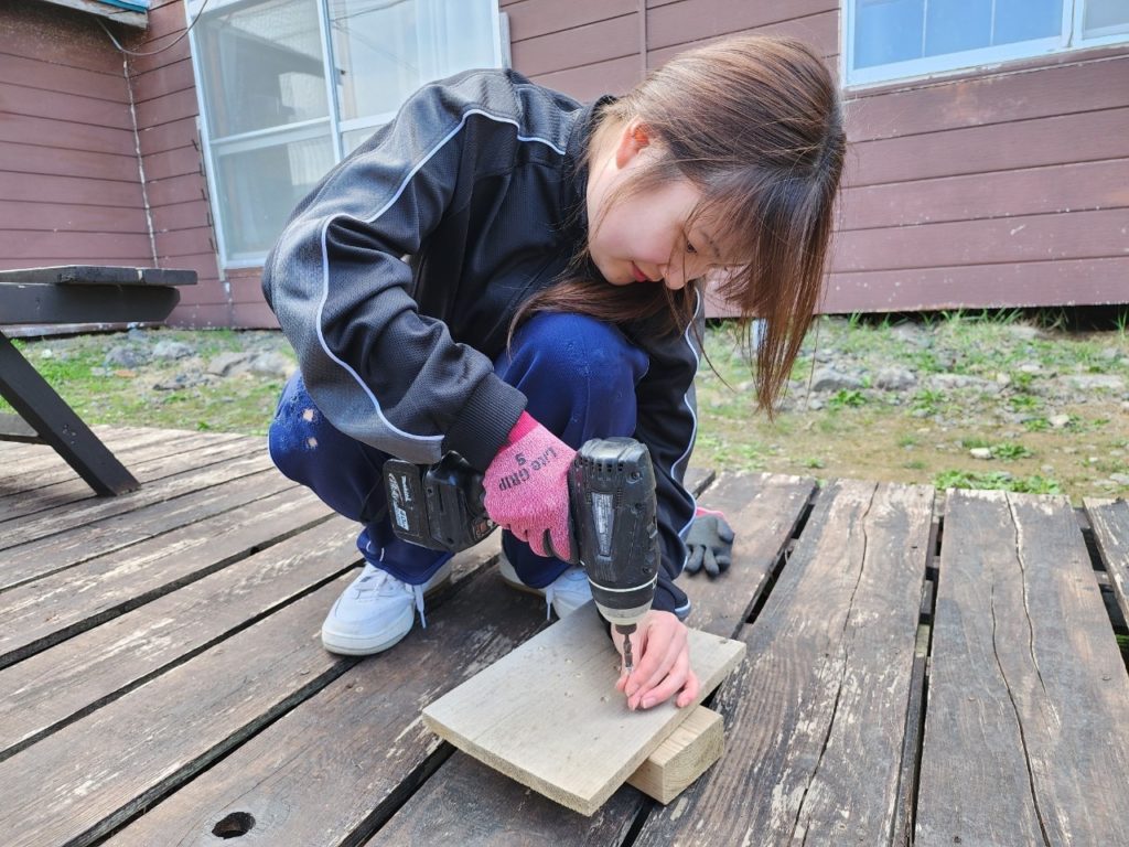 午後からは、DIYするにあたって基本となる工具の使い方について学びました。インパクトドライバーと糸鋸を使いました。そこで、この活動期間中の目標の一つとして。吸い殻のスタンド部分の製作をすることに決めました。デザインや設計を自分で作り頑張りたいです。