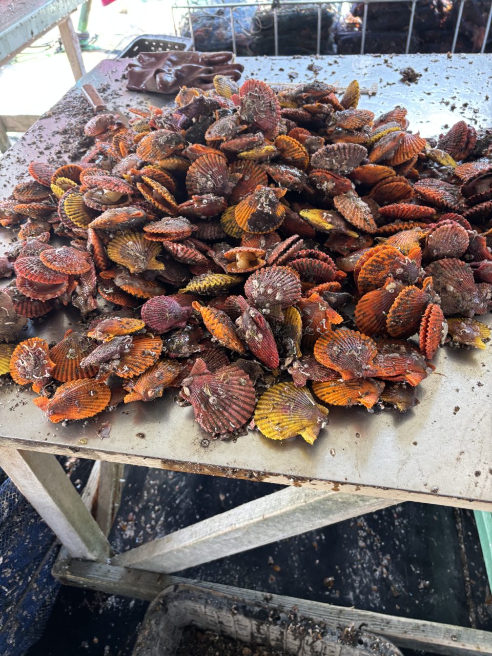 今日からまたヒオウギ貝のお仕事が始まりました。ヒオウギ貝の養殖は、ヒオウギ貝を網に移し替えるお仕事がメインの作業の一つです。ヒオウギ貝を50個や20個、12個など大きさによって1つの網にまとめて、海で育て、ヒオウギ貝が大きくなったら、網を引き上げて、また別の網に個数を少なくして仕分け直します。今日の作業は基本的に50個くらいにまとまったヒオウギ貝を20個にして網に入れ替えるという作業をしました。休憩中は、牡蠣とヒオウギ貝を食べさせてもらいました!どちらもとても美味しかったです。また、途中で沖に船で連れてってもらい、ヒオウギ貝が入った網を海に戻す作業を見せてもらいました!ただ網に戻すだけでなく、ロープや浮き玉についた藻や苔、貝を落とす作業もあり、力仕事であるということが分かりました。私は、会えなかったのですが、今日、屋形島に野生のイルカが来たそうです!たまに屋形島にはイルカが現れるそうなのでいつか見てみたいです🐬。