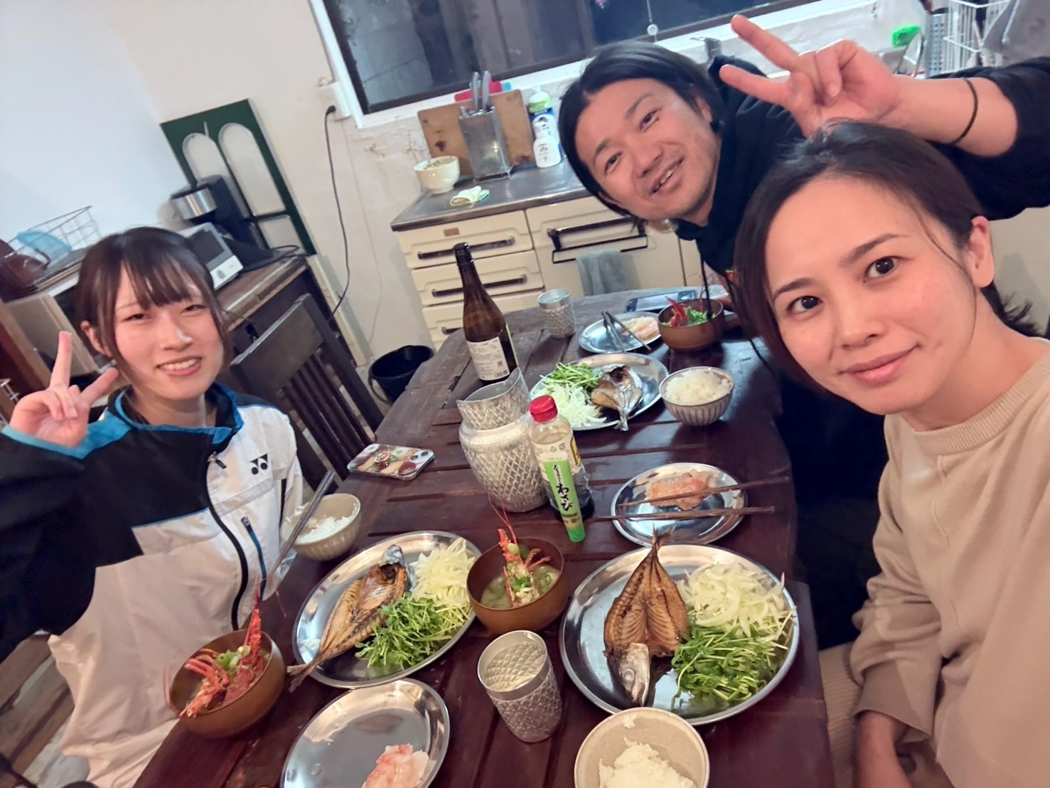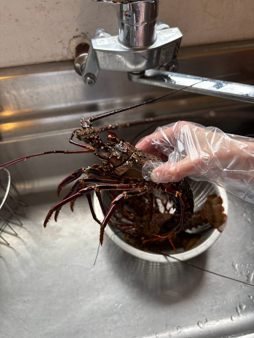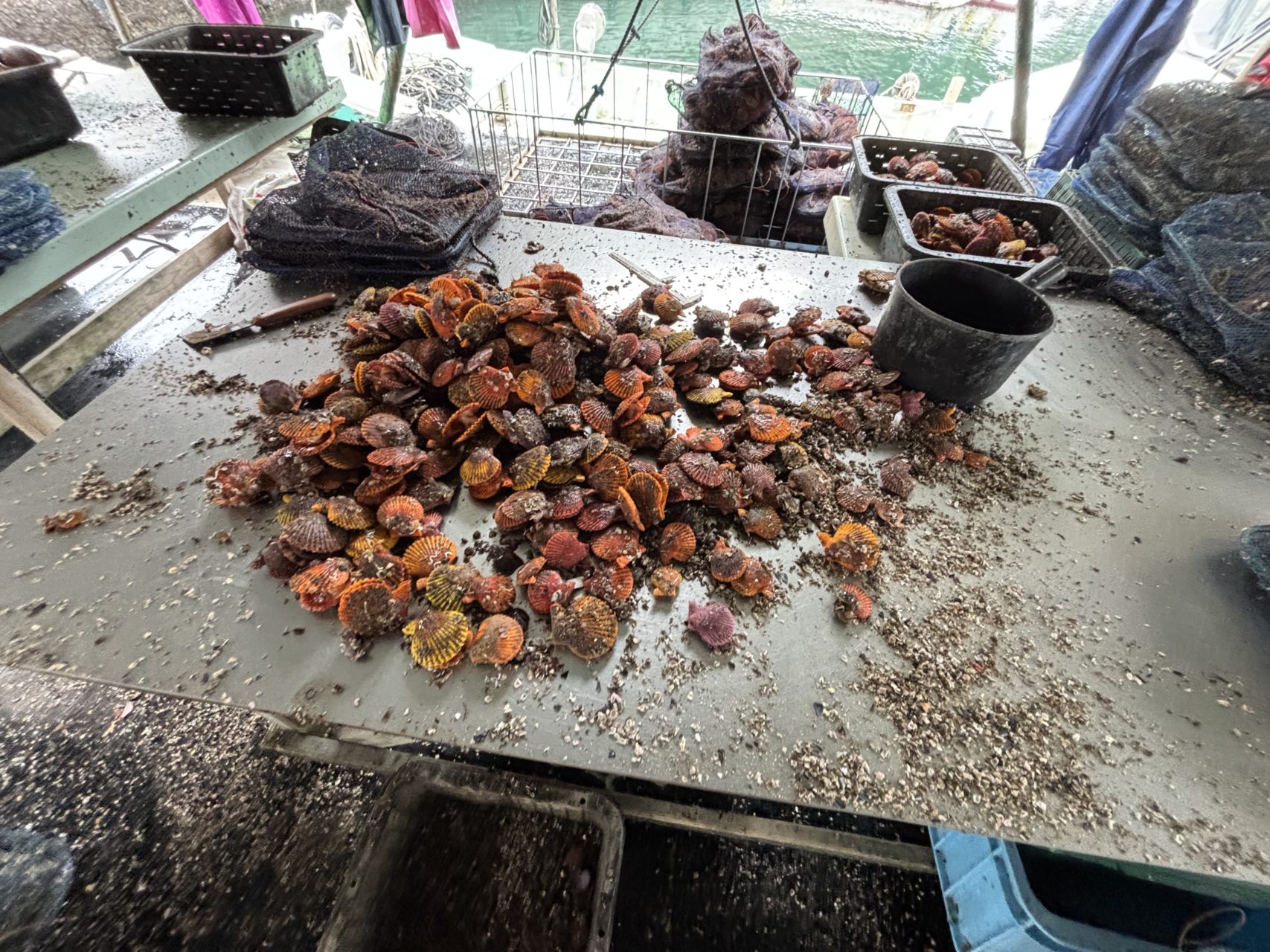 ヒオウギ貝を網に詰める作業と網の洗浄のお手伝いをしました。ヒオウギ貝をよく見るとオレンジ、黄色、紫など様々な色があり特にオレンジ色のヒオウギ貝が1番多かったです。様々な色があるところもヒオウギ貝の特徴だと思いました。ヒオウギ貝は1つだいたい120円〜150円くらいだそうです!また、ヒオウギ貝は一年に1回20万〜30万個の稚貝を仕入れてそれを育てながら一年を通して出荷していくスタイルだそうです。稚貝を見せてもらいましたがとても小さくてびっくりしました。作業中は一緒に作業している方々が色々話しかけてくれて嬉しかったです。作業の最後に伊勢海老を3匹貰いました!!ありがとうございます!生きている伊勢海老を触るのは初めてでビックリしました笑!この伊勢海老はたけしさんとあやかさんがお味噌汁にしてくれました。出汁がでててとっっても美味しかったです🦐