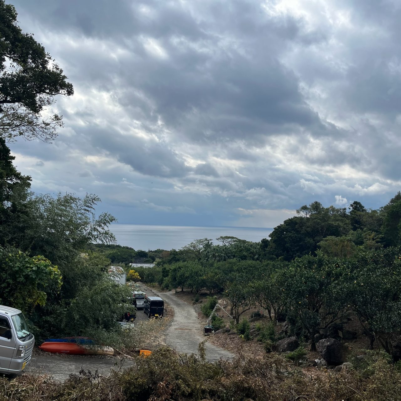 午前中は農園の作物の木が倒れないよう添え木に使う竹を切りました。久しぶりに使うノコギリはとても難しかったです。竹藪の中を掻き分けて竹を切っていく作業はとても体力がいり、へとへとになりました。けれど、ふと海側を見ると頑張れと言わんばかりのきらきらとした海の景色が広がっており、とても癒され見るたびによし頑張ろうと思うことが出来ました。海も山も近い屋久島ならではの景色だな、と再認識した瞬間でした。