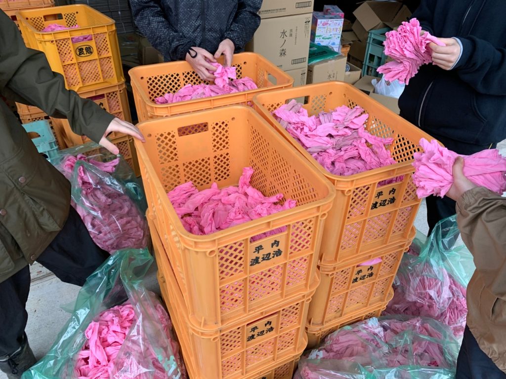 屋久島5日目!今日は昨日に引き続き渡辺さんのタンカン畑でサンテ取りとサンテの仕分け作業を行いました。一通り体験した作業だったため、皆昨日よりも効率的に作業を進め、格段に取るスピードが上がっていました。昨日はじゃがいも掘りやタンカンちぎりに比べると身体的負担の少ない作業で、満足のいく作業を出来ているのか不安でしたが、サンテを取り終えたタンカンを農家さんがちぎっているのを見て、ちゃんと助けになれているなと感じられました。1時間ほど作業を行い、ピンクばかり目立っていた農園が段々とオレンジ色を取り戻して来た所で雨が降り始めてしまったため、急遽渡辺さんの倉庫へ戻り、サンテ仕分けの作業へ移行する事に。この作業も昨日行っていたため、少し想定の時間より長引いてしまいましたが、用意されていたサンテ全てを仕分け出来たため達成感を味わいました。完璧に最後までタスクをこなせたのは初めてだったので嬉しかったです。明日は完全休養日みんなで屋久島をサイクリングする予定です。