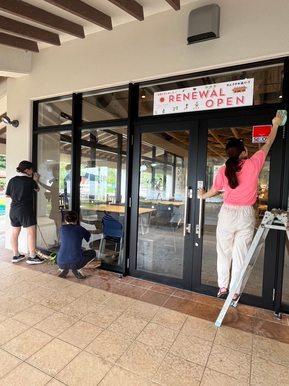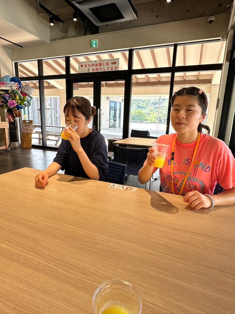 朝から場所を移動して、わんさか大浦パークでゴミ捨て場付近のゴミ拾いと、建物の窓拭きを行いました。太陽をたっぷり浴びて汗をたくさん流しながら、草や石に紛れたプラスチックゴミを拾いました!遠目から見るとゴミがあるようには見えませんでしたが、近くで見ると小さなゴミが多くあることに気づきました。小さな変化に気づきこまめに管理することが地域の環境の維持につながっていると分かりました。そして潮風を浴びた窓をきれいにできるよう仲間と役割分担をしてひたすら拭きました!外での作業であったため、休憩時間を細かく確保していただき、涼しい場所で休んでいたらシークワーサージュースを持ってきていただきました。私が飲んだことのあるものより黄色く、酸っぱさと甘さを両方強く感じました!また次の休憩時には、絞りきったシークワーサーの皮を使ったシークワーサーのサーターアンダギーをいただきました。汗を流した体にはぴったりすぎるシークワーサーの食べ物をいただきどんでもなくエネルギーチャージされました!!