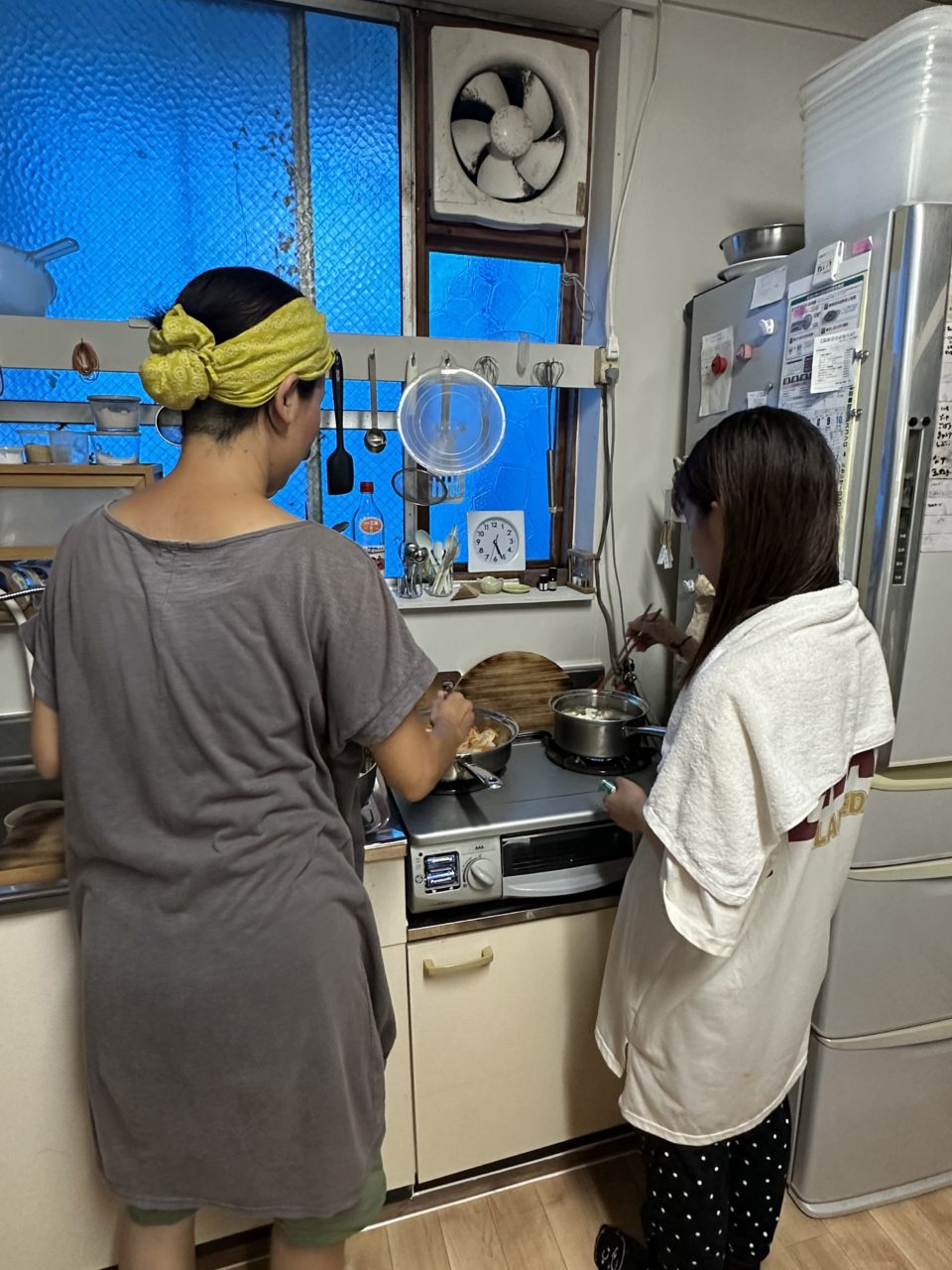 そしてその後は民泊を体験させていただきました。2人ずつに分かれてそれぞれの家で時間を過ごしました。私がおじゃまさせていただいたお宅はお昼ご飯を作ってくださったお母さんのお宅で、フーチャンプルーとアーサー汁をいただきました。重ね煮という料理法で調味料はあまり使用されていないのですが、こんなにも満足感のあるご飯は食べたことないというくらいとても美味しかったです!!