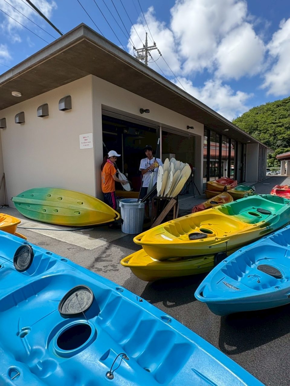 もう一組はカヤックツアーの準備として、カヤックの水抜きやパドルの洗浄を行いました。カヤックを持って移動する際には、意外な重さに驚き、手にマメ予備軍がたくさんできたようです💧