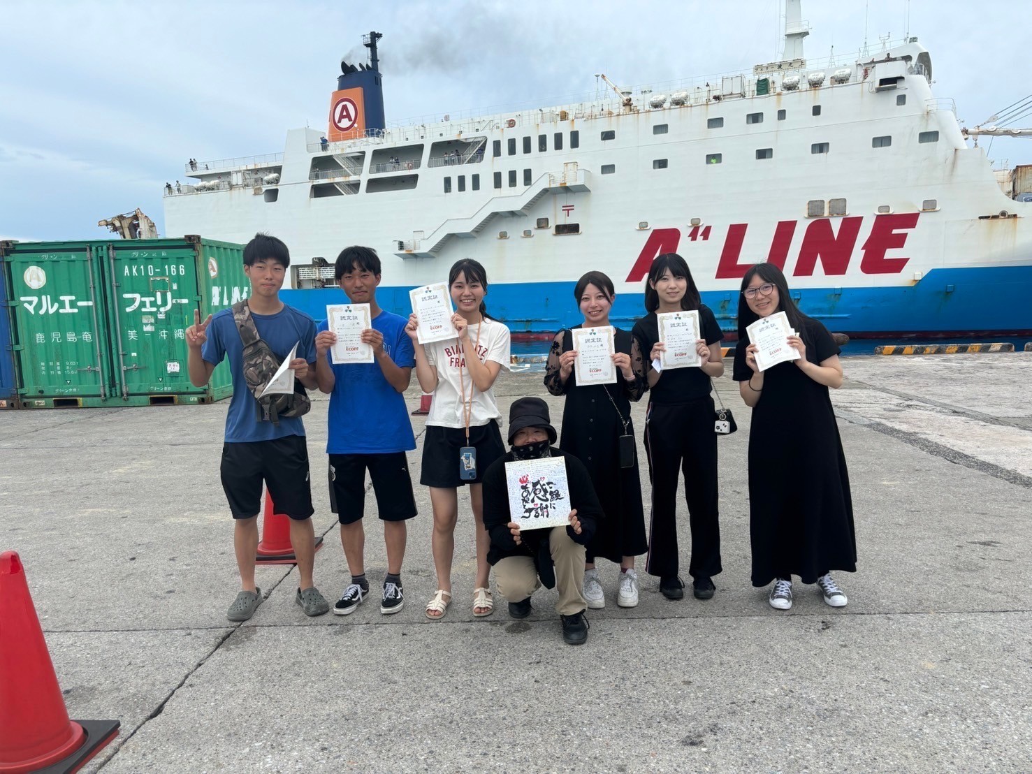 今日はボランティア活動最終日でした。午前中は宿の掃除、昼は世話人の野口さんおすすめの薬草カフェで昼食をとりました。薬草カフェでは、今まで食べたことのない独特な薬草を使った美味しい料理や飲み物がとても印象に残りました。その後は港へ移動しました。船を待つ時間は、世話人の野口さんへの感謝の気持ちを込めて色紙をプレゼントしたり、記念写真をとったりしました。また、ボランティアの認定証をいただきました。今回のボランティアを通して、与論島の人々の生活や文化、言葉などを学んだり、仲間と協力することの大切さを理解することができたり、コミュニケーション能力が向上したと思います。世話人の野口さんをはじめ、ボランティア活動に協力してくださった島の方々、活動中常に親切に接してくださり、ありがとうございました。メンバー全員が与論島のことをとても好きになりました。