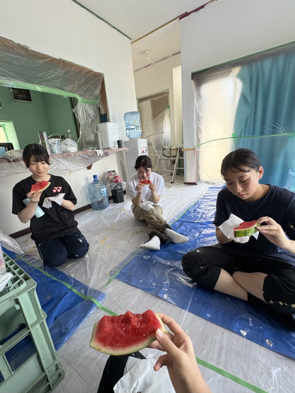 DIYは時間いっぱいまで塗料を塗り続け、玄関・トイレ・リビング・廊下まで作業を進めることが出来ました。作業後は世話人のさよ子さんが持ってきてくださったスイカを皆で美味しくいただきました!