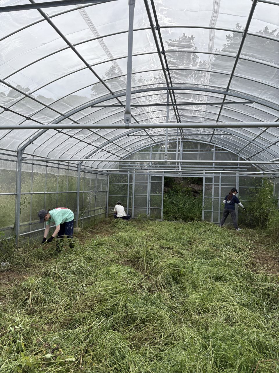 午後はシャロン農園さんで収穫後のビニールハウスの草刈りをしました。色々な虫たちがたくさんいて少し苦戦しましたが6人で協力して山盛りの草を刈ることができました。