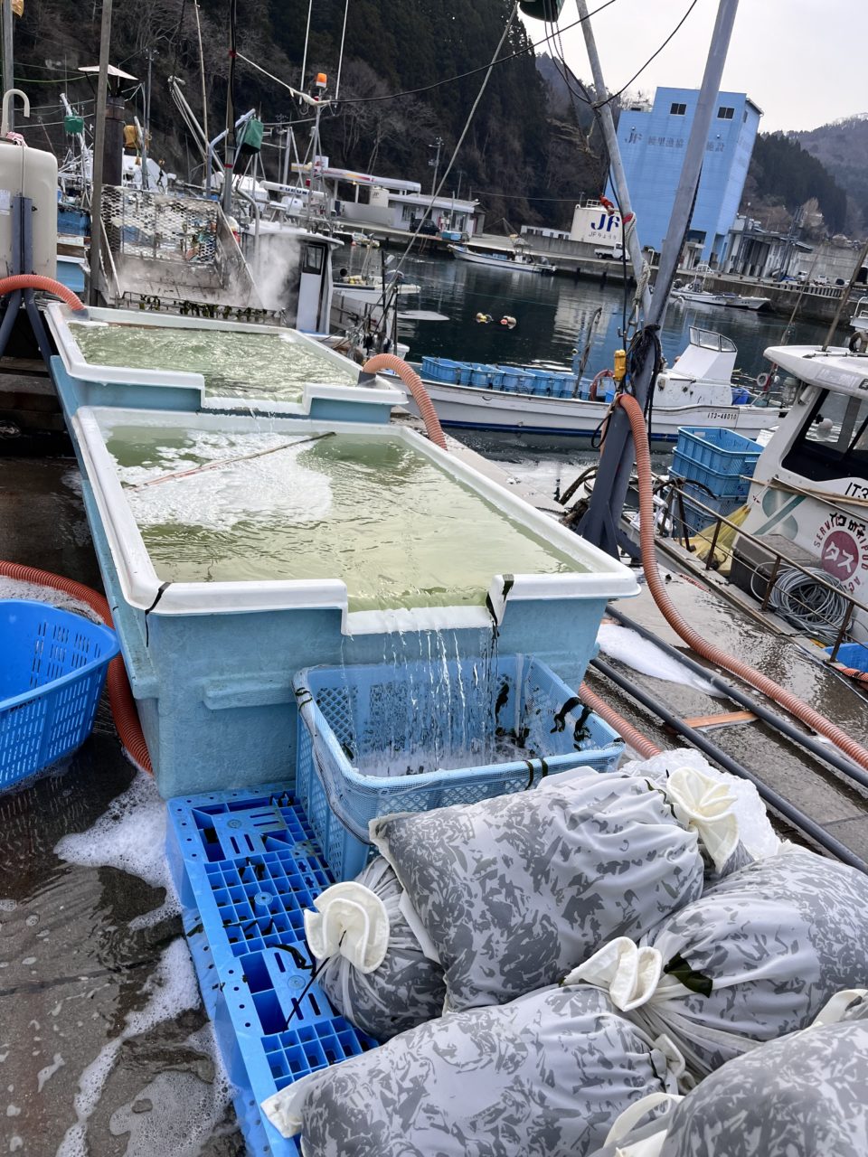今回初参加のおのじゅんです。三浦家のお手伝いをしました。何もかもが初めての作業。何をしたら。お隣のおじさんが茹で上がったワカメをメッシュ袋に入れるように指示される。黙々とワカメをメッシュ袋に入れる事34袋。こんなに大量のワカメを見る事は初めて。