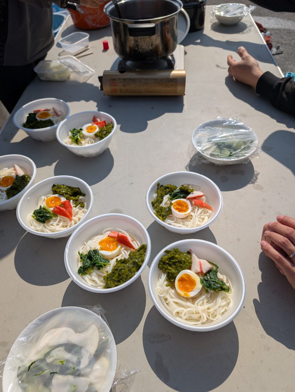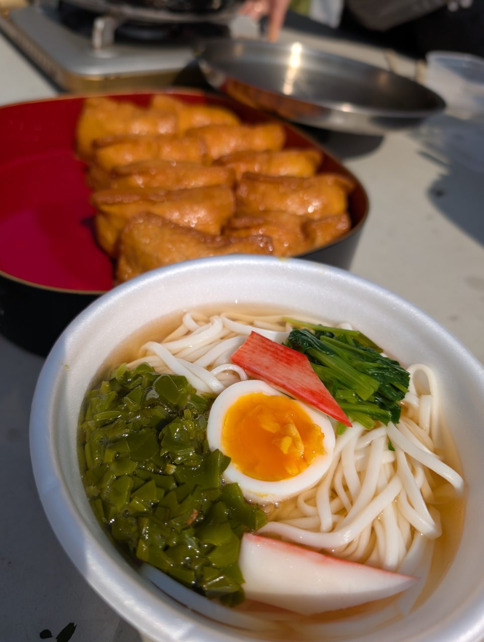 刈りきって朝ごはんはうどんとお稲荷さん。スイスからトレイルで見学者あり。