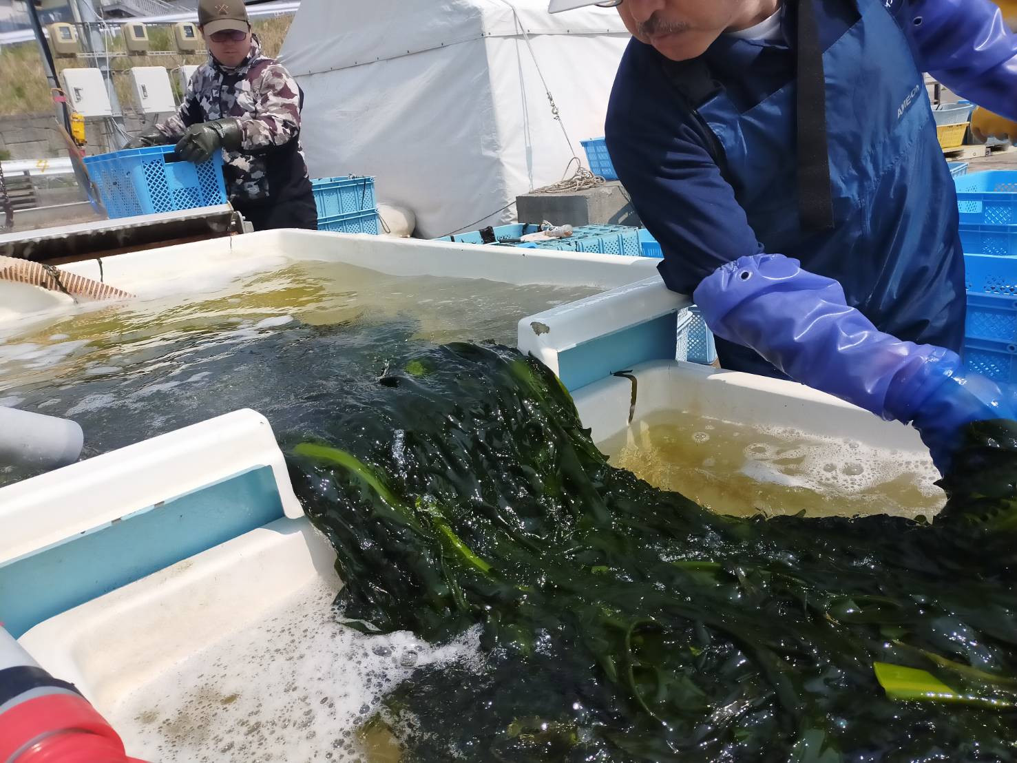 本日の朝は3時30分に起床し、初めて船上でのワカメ狩りのお手伝いをさせていただきました。