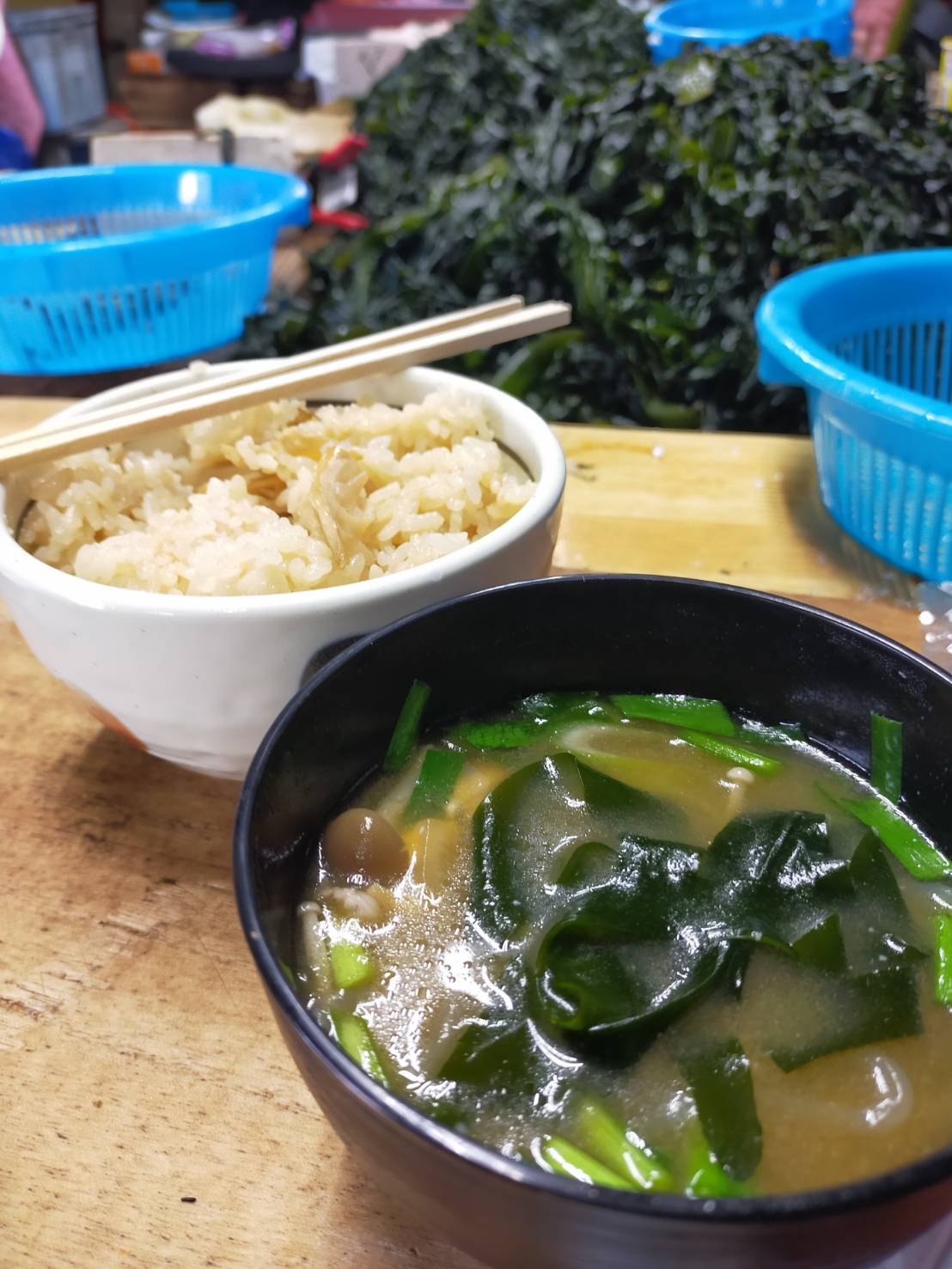 ゆでて冷やして、ご飯を一緒にたべて、ワカメを成形して、、、少しずつではありますが流れも見えてきました。(京のご飯はたけのこご飯と豚汁でした。とってもおいしかったです!!)