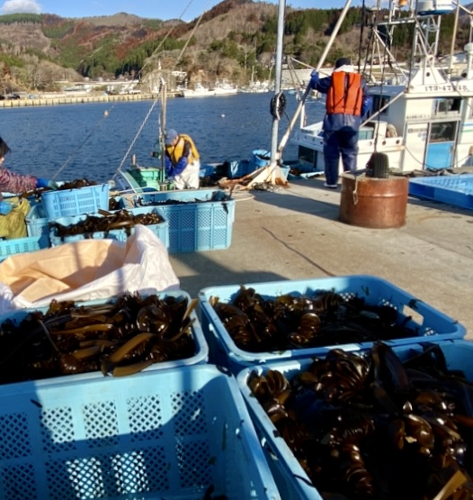 今日も朝6時からメカブ作業のお手伝い。メカブカッターでシュッとメカブの部分をそぎ、ワカメの茎とメカブをどんどん切り分けていく。